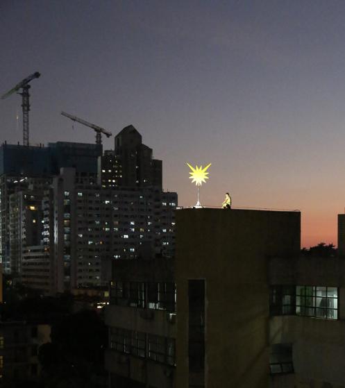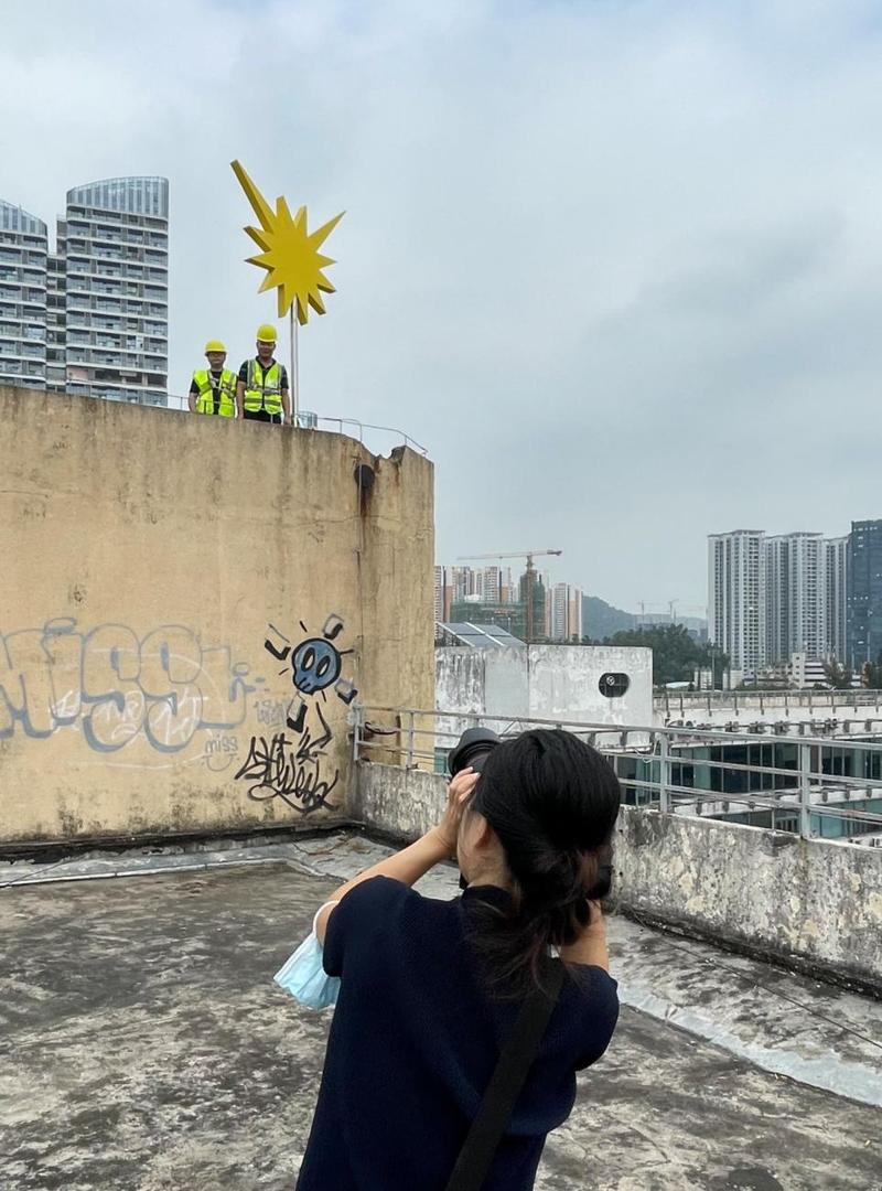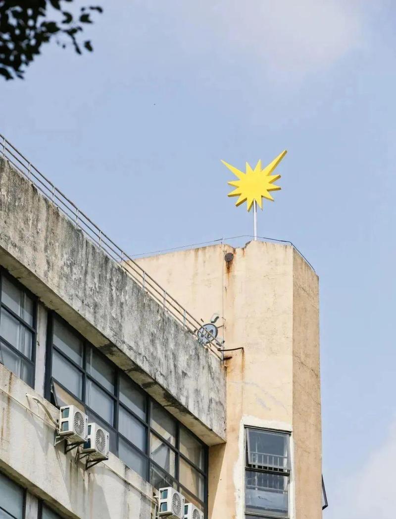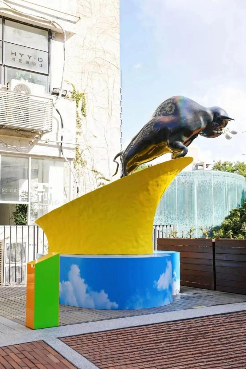 隔街相望的就是“明天见”艺术组合带来的《牛星高照》。这个奇特的十二角星,位于创意园北区入口右侧A3栋楼顶,缓慢旋转, 给创意园社群增添“牛星高照”的祝福和问候。