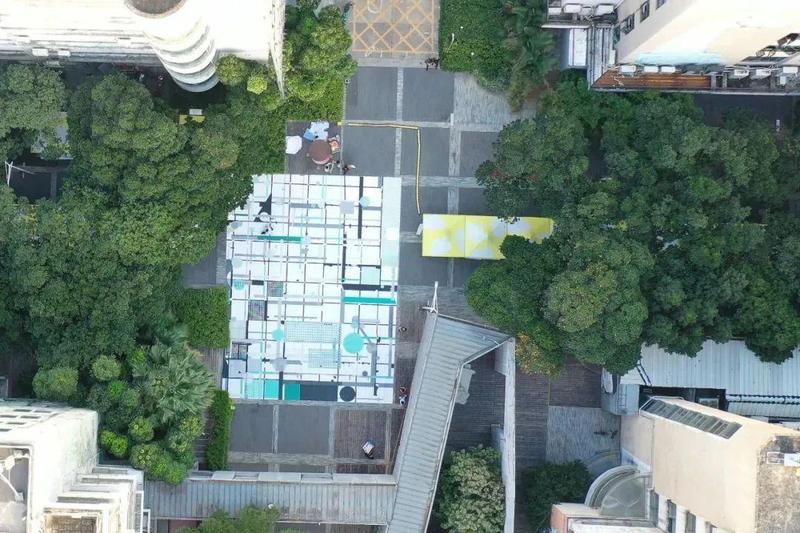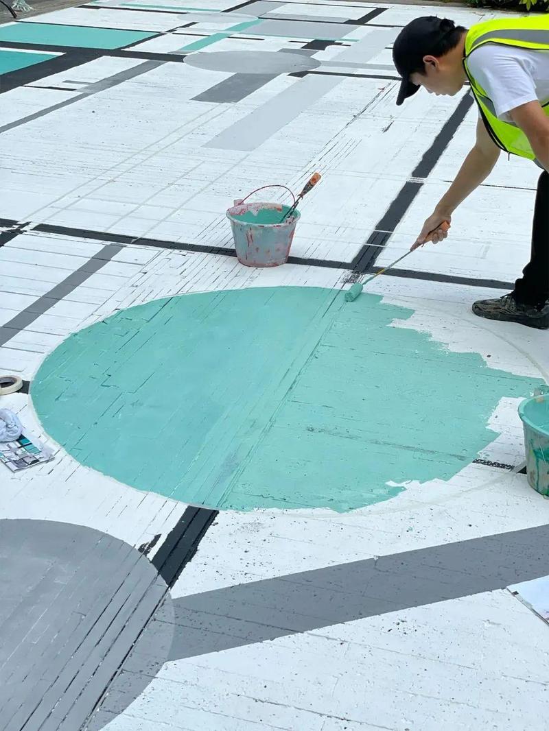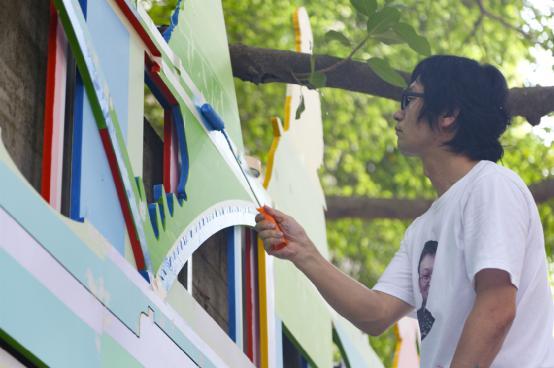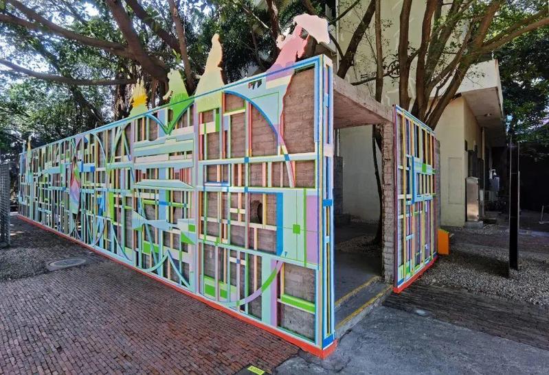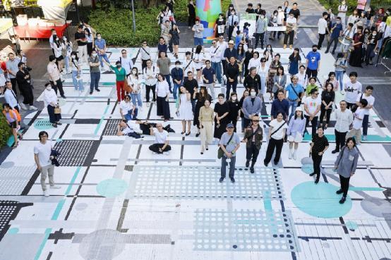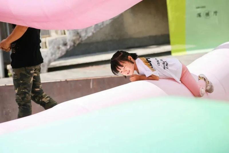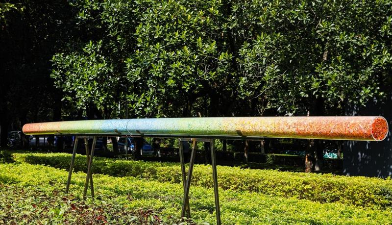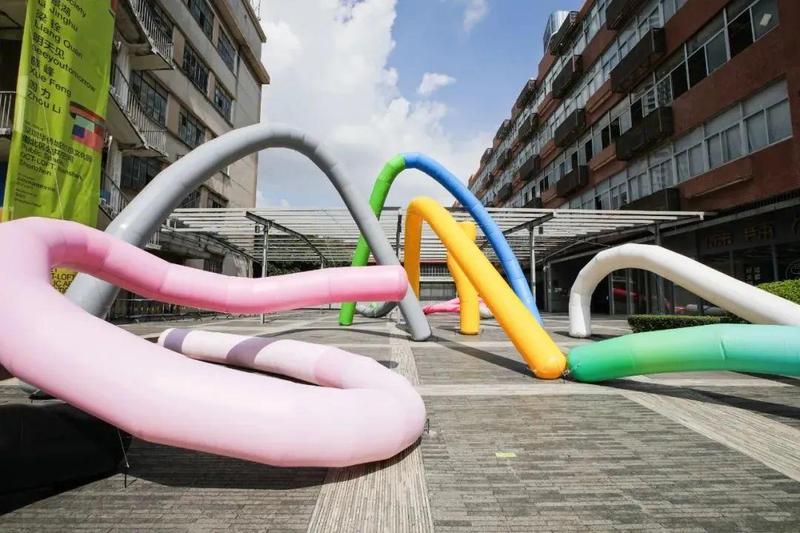 北区文昌街广场上展出的则是这次展览中体量最大的作品《彩虹》。艺术家周力的工作室就在园区之内,她以自己绘画以及雕塑作品当中最为人熟知的线条为视觉元素,为自己工作的社区精心创作出了色彩斑斓的景观。