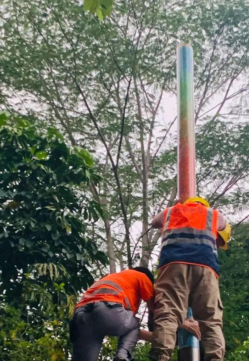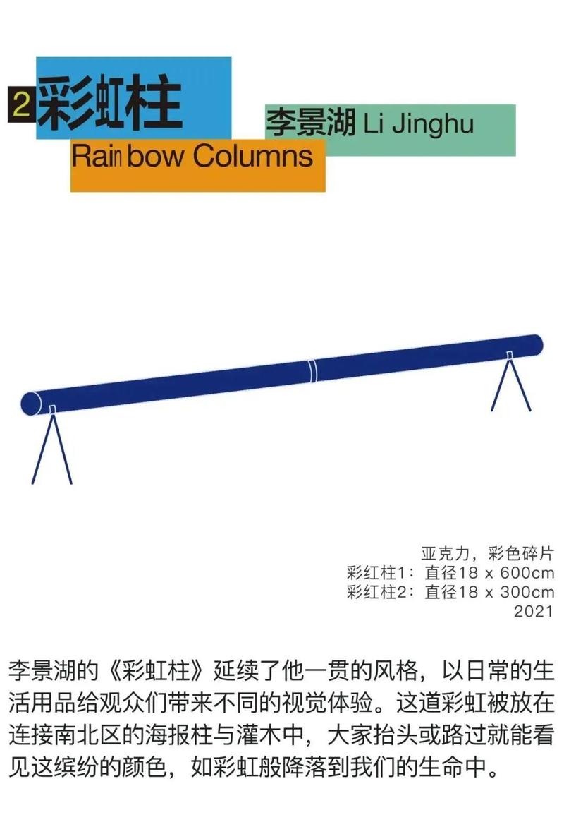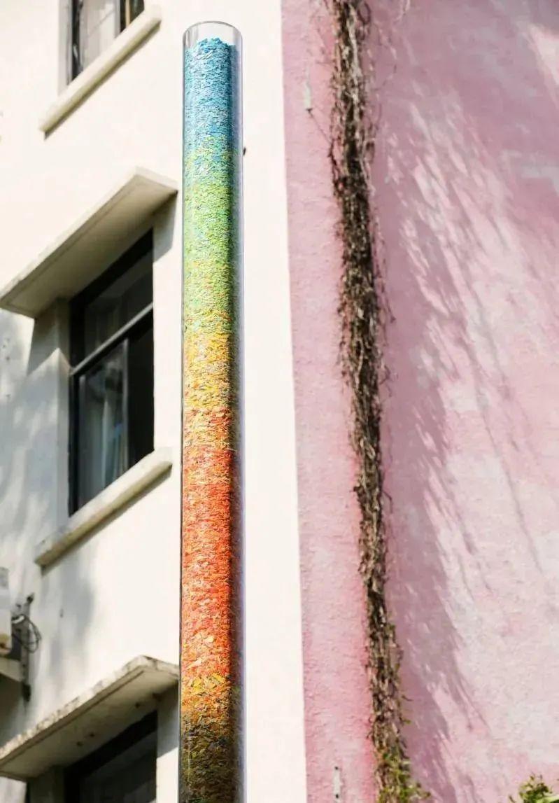 在靠近香山东街的路口处则可以看见李景湖的作品《彩虹柱》。作品使用的是普通家庭的生活用品,打成碎片后再按彩虹的色谱摆放在有机玻璃柱之中,也传递出“艺术来自生活”的朴素气息。