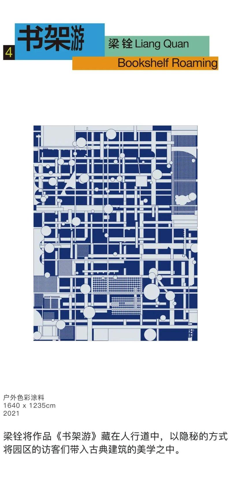 再往北走一些,便会在地上看到梁铨的《书架游》,这件大型的地面绘画作品的画面是艺术家根据清朝皇帝书房天顶画所作的变体,路人漫步其中,可以用别样的方式来体会古典建筑美学。