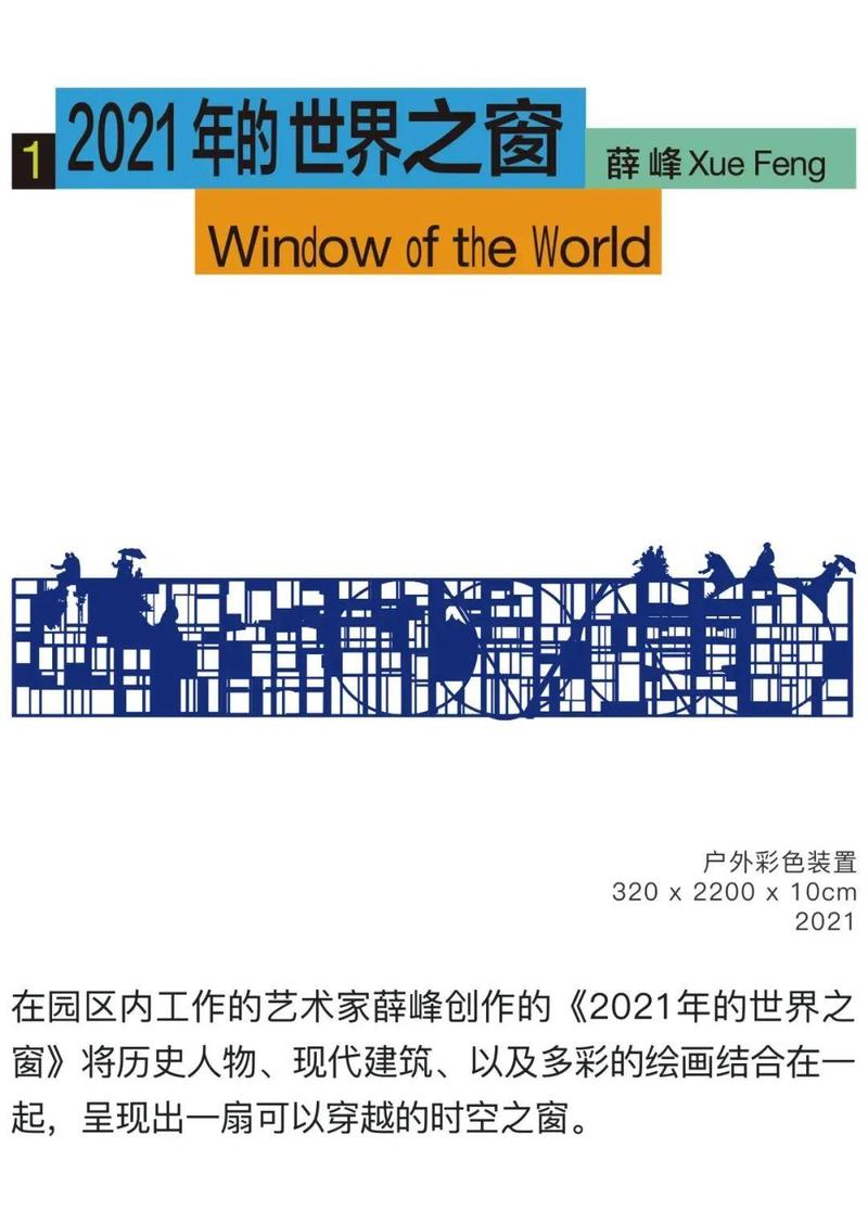 紧邻创意园南区入口处的是薛峰的大型绘画装置《2021年的世界之窗》,这件由大小不一的几何形状构成的作品有着三层结构:象征世界的圆,代表千家万户窗户的矩形,以及九个现代史中的人物形象。各种人物与游船、现代建筑、层叠的山峦等各式造型被置于一个时空之中。