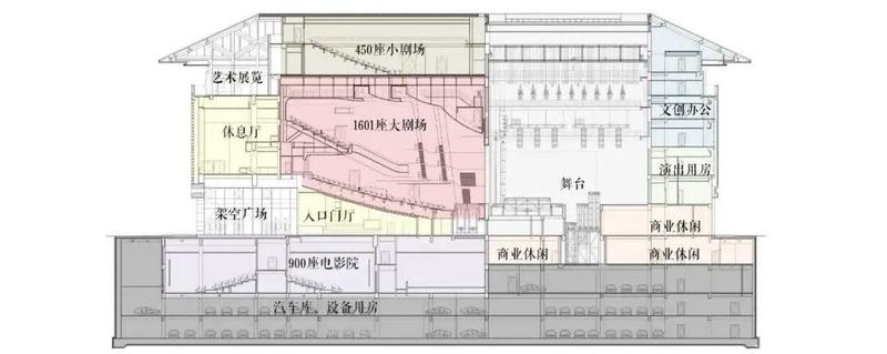 四川大剧院内包含了1601座的综合剧场、450座的多功能音乐厅、7个影厅共900座的电影院,以及沿街布置的相关商业配套等。