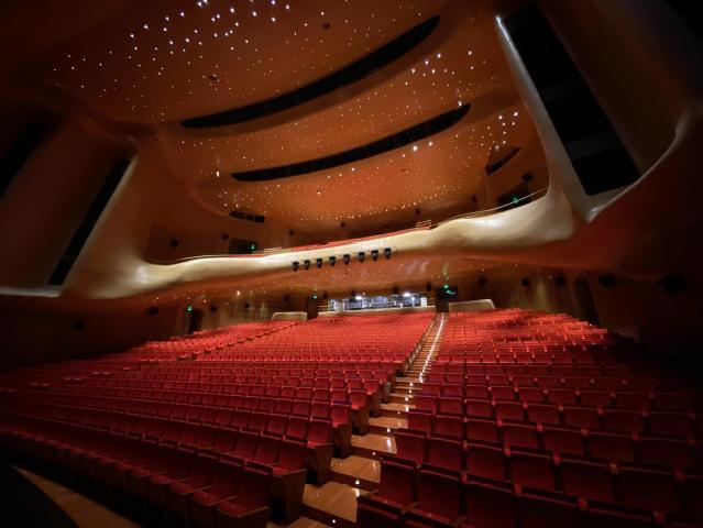 大剧场1601座的观众厅采用一层池座、一层楼座设计,突破现有同等规模剧场设计, 在保证视距的前提下,采用中排距、大宽厅、扩开口的方式提高平面座位的布置效率,楼座最后一排视线仅24.5°,避免二层楼座一般较为陡峭的观演感受,在兼顾视线的同时,让观众达到更佳舒适度,同时也巧妙降低了空间高度。