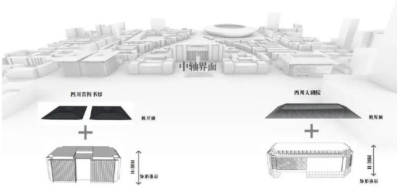 以城市中轴线对称展开,强调大剧院与图书馆相互协调对应,形成完整城市空间。