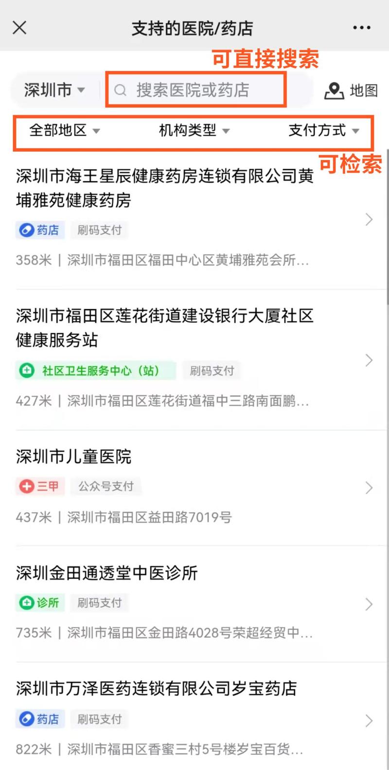 路径:支持的医院/药店→可输入医院或药店名称搜索,也可以通过辖区/机构类型/支付方式进行检索