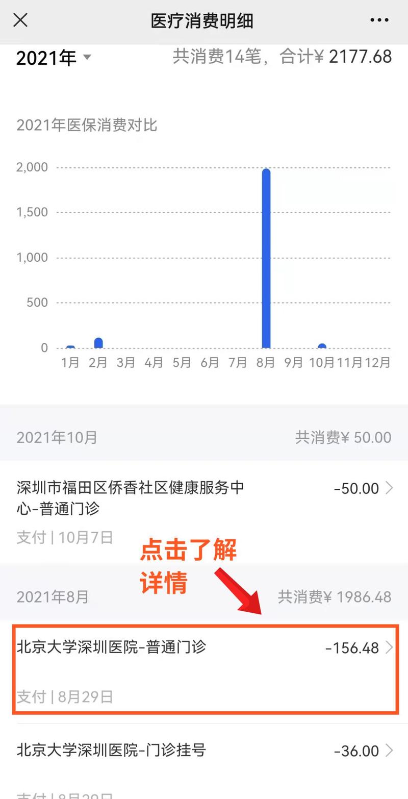 点击每一笔医疗消费,可查看医保个人账户、医保统筹基金、个人现金等各类型支付金额