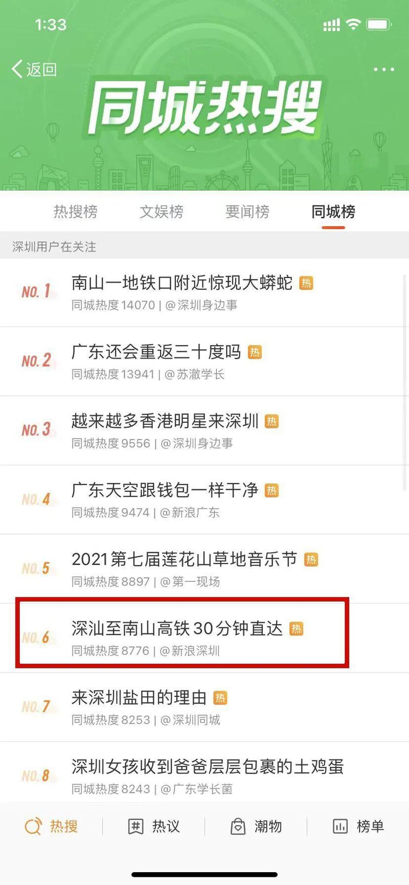 【深汕铁路环评公示年底开建 #深汕至南山高铁30分钟直达#】话题阅读量166.5万,登上微博同城热搜第6。