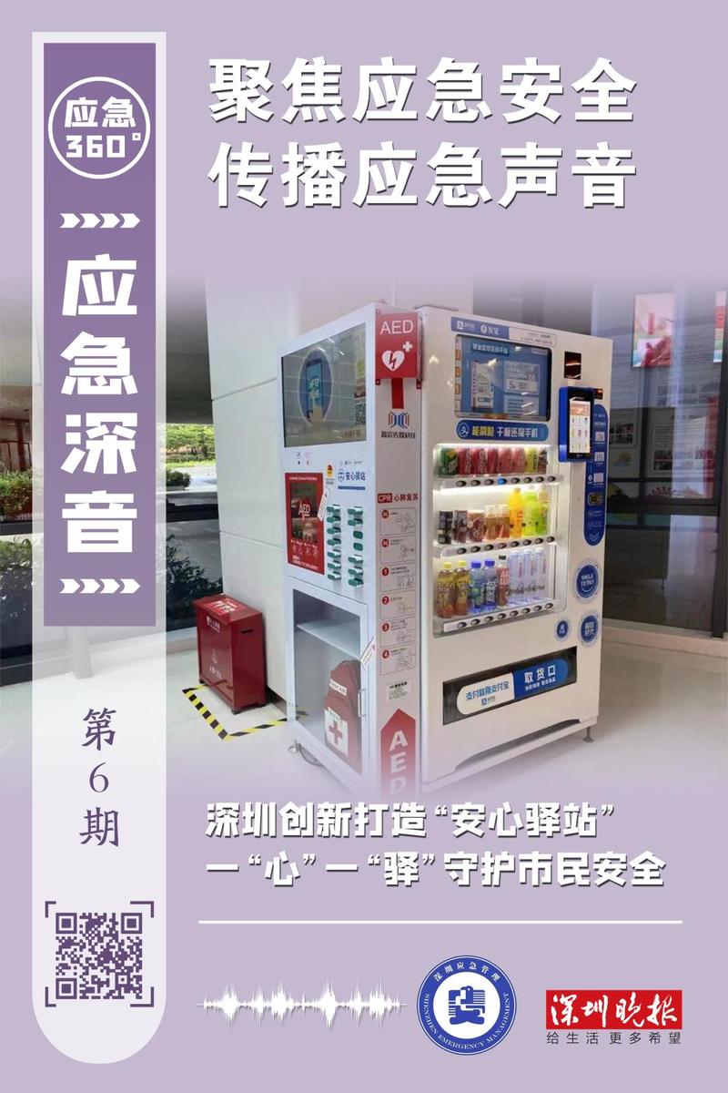 在深圳街头,我们经常能看到一些特别的智能售货机,这些售货机除了正常的售货功能,还配备了"救命神器"—— AED自动体外除颤仪和相关应急物资包,还能够在紧急时刻播报预警信息,提供应急指引,它就是 " 安心驿站 "。