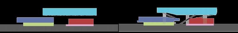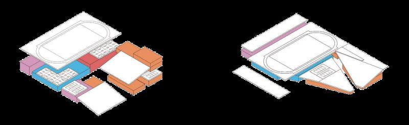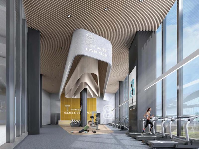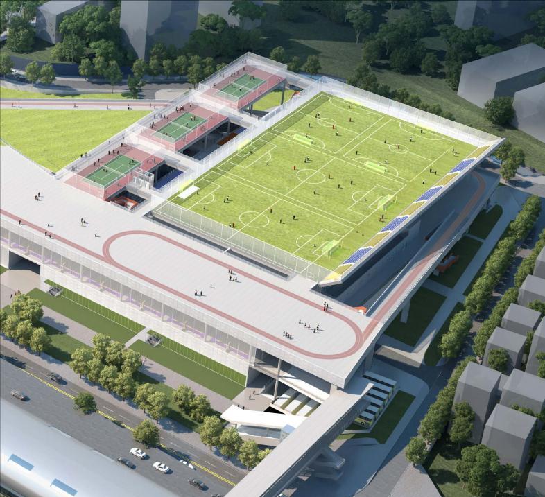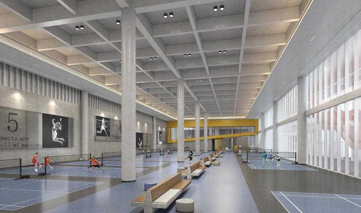体育中心为框架结构,通过架空层与交通连廊连接各个场馆。篮球场、儿童运动乐园及攀岩场地均设在架空层,方便市民使用;七人制足球场、网球场及便民健身区设置在屋顶,满足市民日常体育锻炼需求;主要服务大浪街道及周边社区,用于中小型赛事与大众健身的游泳馆,则设在首层,主要由比赛池、练习池、看台、辅助用房及设施等组成。包括1块标准游泳池、1块标准训练池和1块儿童戏水池,设置350座观众席。地上一至四层,则设置羽毛球、乒乓球等其他场馆,设置3000坐席。此外,大浪体育中心还计划设置真冰场,让大家在炎炎夏日有个清凉的好去处。