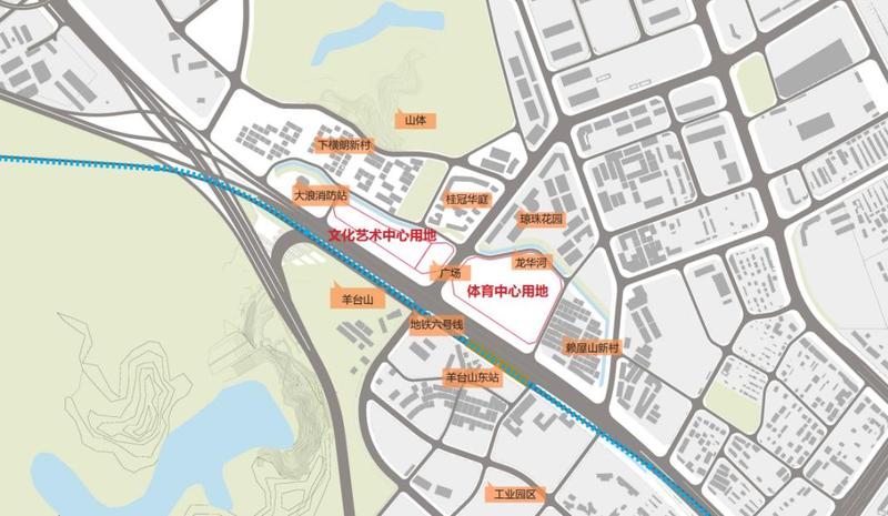 大浪文化艺术中心,位于布龙路与华旺路交会处北侧,与大浪体育中心一街之隔,并与其通过空中连桥和华旺路底人行通道相连。将建成一座面向龙华区的集文化艺术与休闲娱乐于一体的区级文化艺术中心,配套公共图书馆、剧场、文化馆及艺术馆等文化艺术设施。