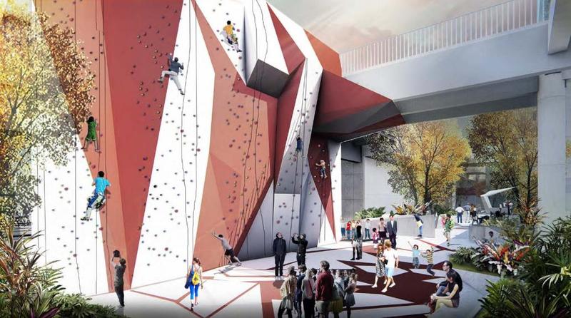 ▲架空层攀岩区设有大小攀岩墙