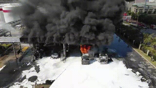 油罐车装卸油品时突然起火引燃周围车辆,事发现场紧挨储油罐