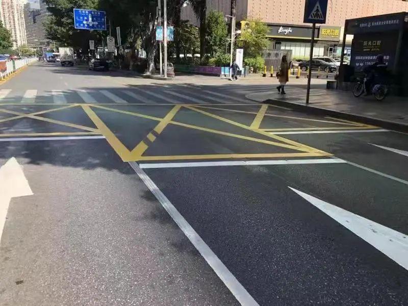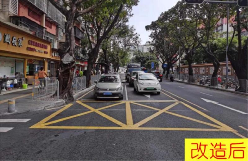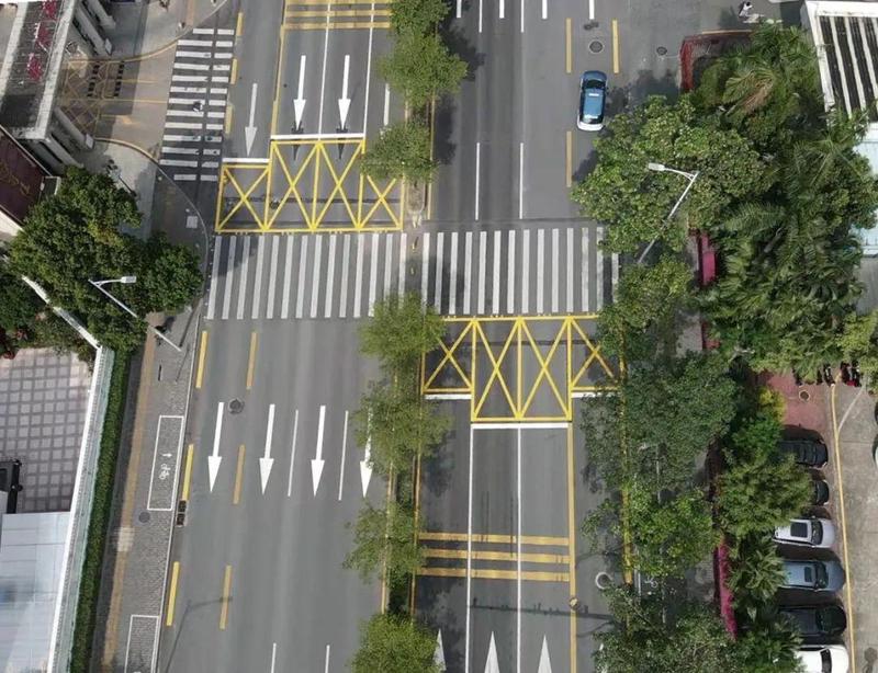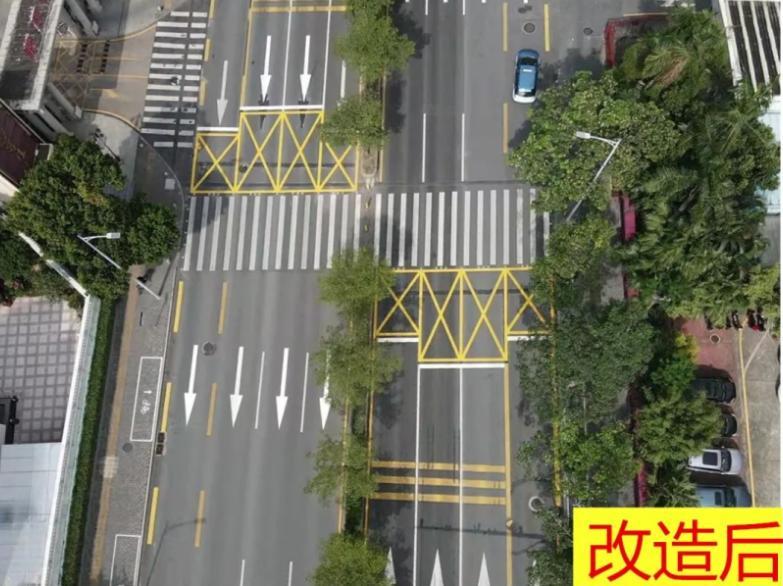 怡景路口双方向均施划了阶梯状的黄方格禁停区,并采用“5m-7m-5m”的标线长度,分别错开两侧及中间车道的停止位置,形成“阶梯状”排列。