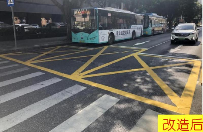 通过增设黄方格禁停区、增强斑马线前车辆降速提醒作用。