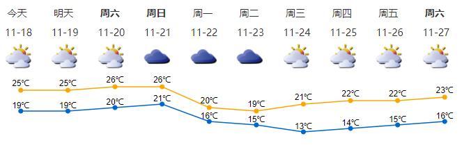 ● 11月18日,多云间阴天,偶有零星小雨;气温19—25℃;东北风3—4级,沿海、高地和海区阵风6级;相对湿度50%—85%。19—21日白天多云,可见阳光,气温回升。21日夜间起新一股冷空气影响,阴天有分散小雨,北风加大,沿海、高地和海区最大阵风7—8级,气温骤降,下周前期天气寒凉。