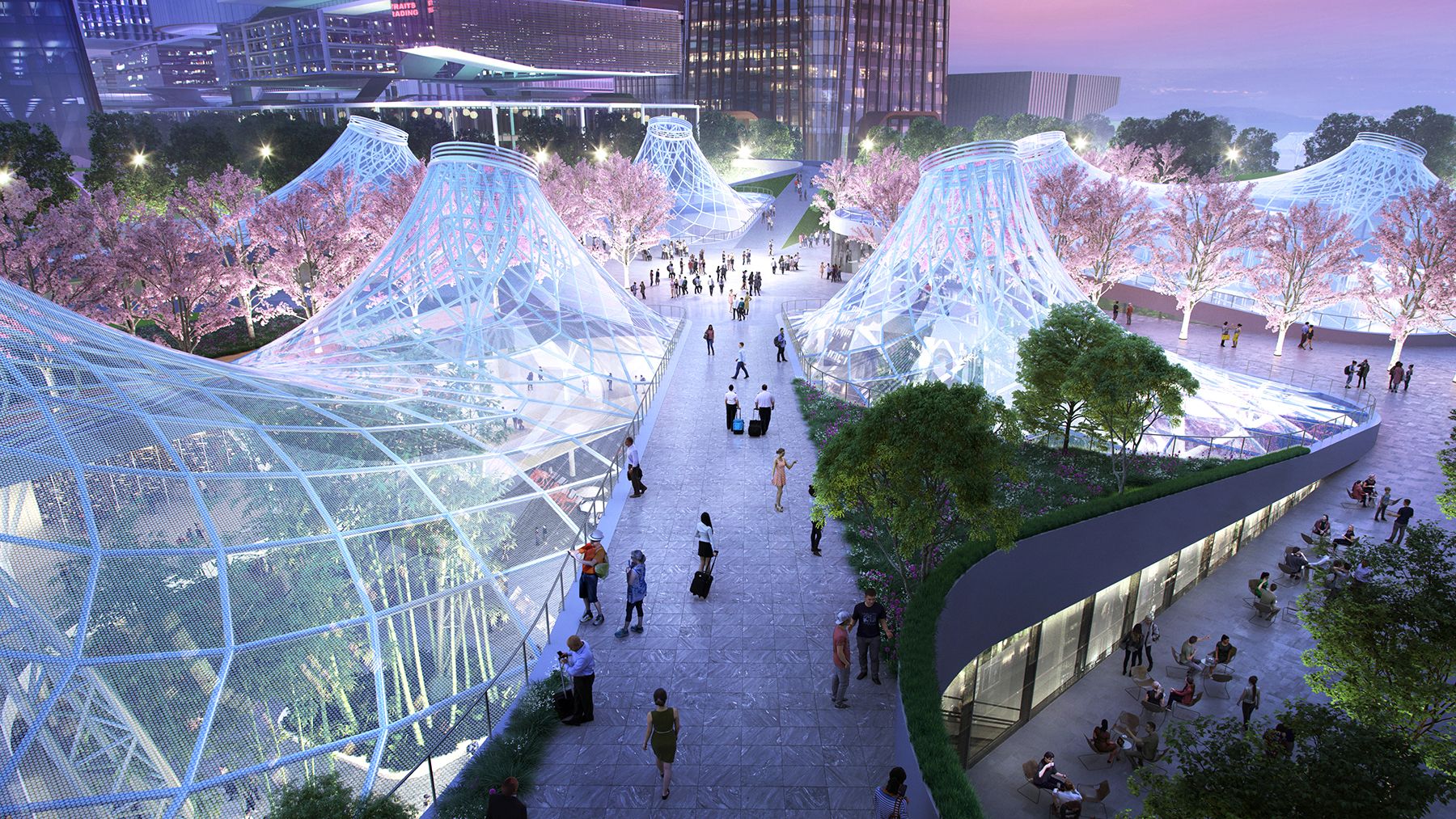 中央绿轴中段为车站广场,该广场“水晶山丘”屋面覆盖着地下枢纽大厅,在地面创造出独特的城市地标,与地下繁忙的共享大厅、地下森林、地面广场、周边建筑之间建立视觉联系,成为公园美景的一部分。夜景光影与相交的花旗木大道配合,打造极具设计感的车站广场空间。