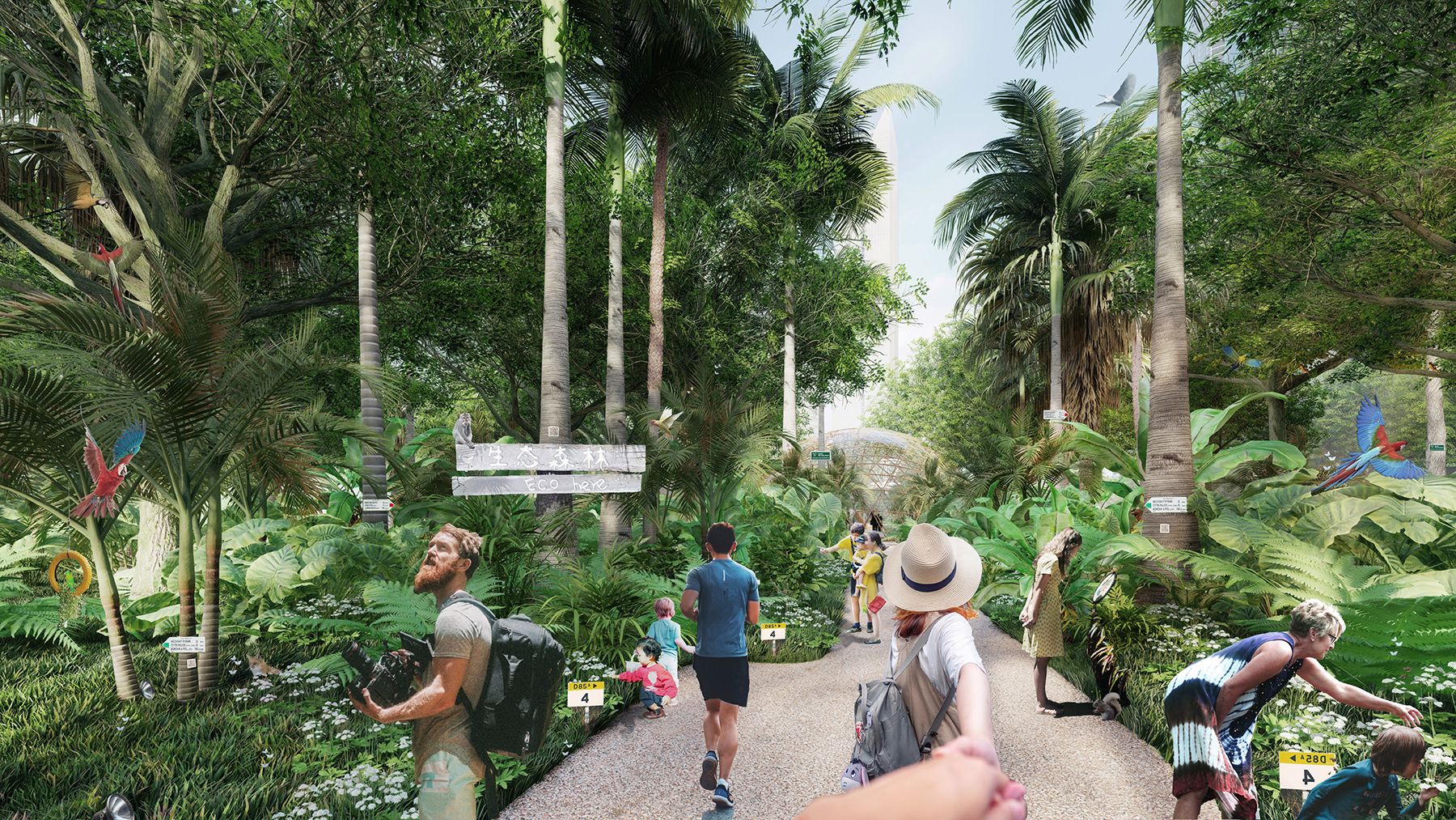片区模拟深圳山地森林环境和大湾区典型的生境群落,在城市中心营造出自然教育与沉浸式学习的环境,设置生态教室、温室等,形成户外自然科普中心。