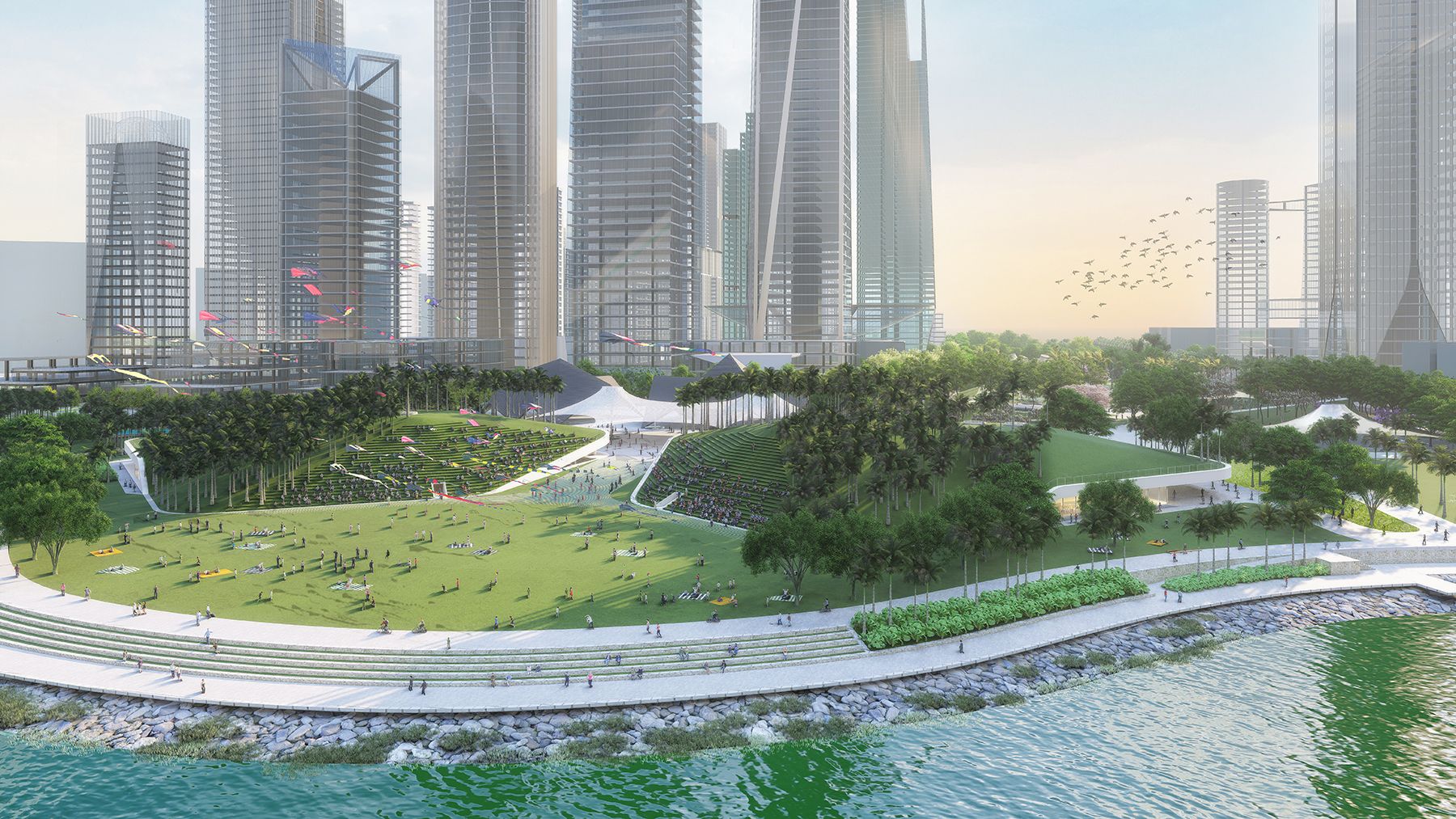 中央绿轴南段为演绎与艺术公园,是艺术表演群体和爱好者们交流、练习、演出和欣赏的空间。该区域连接周边街区的文化设施,将超级总部及周边的文化创意功能引入公园,为深圳和全球的创意群体服务。