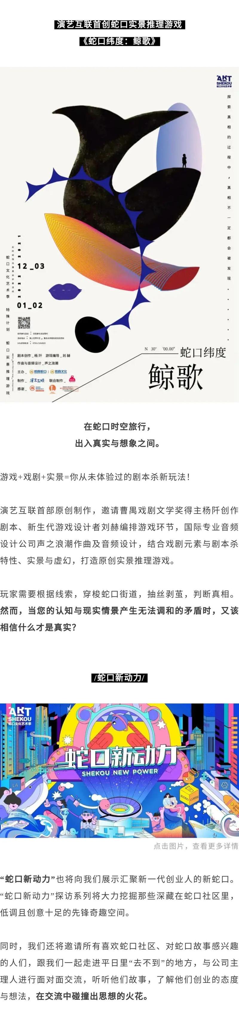第二届蛇口文化艺术季基于“打造蛇口国际人文社区”的创始理念,以海上世界文化艺术中心为核心,辐射至海上世界、南海意库、网谷双创街、四海公园等,形成“蛇口文化网络”。