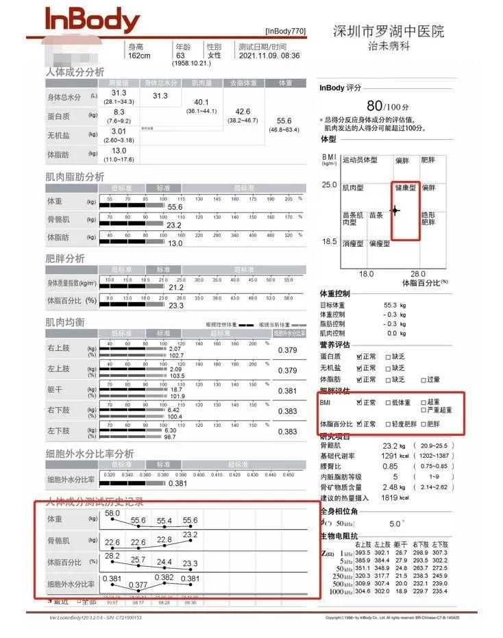 中医慢病体重管理营第2期小伙伴,长期血糖偏高,坚持未服药物治疗,2021年9月11日查糖化血红蛋白8.0%偏高,身体成分分析Inbody提示体型轻度肥胖,体脂百分比偏高,出院前空腹血糖控制在6.0mmol/L左右,经过住院+门诊居家体重管理2月后,复查糖化血红蛋白6.7%,空腹血糖稳定在5.6-6.0mmol/L,体脂百分比下降4.9%,身体成分分析Inbody提示体脂正常,是健康型体型!
