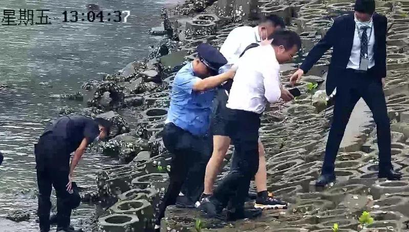 当时男子位置距离岸边有20、30米。防洪堤下礁石嶙峋,海底情况更不得而知。危急时刻,只见韩沈春敏捷地翻越护栏,迅速扎进海里。靠近轻生男子后,韩沈春一把抓紧男子的腰带,奋力将其向岸边拉。其他队员和保安也纷纷下水一起参与救援。最终,轻生男子在众人的协助下安全回到岸上。