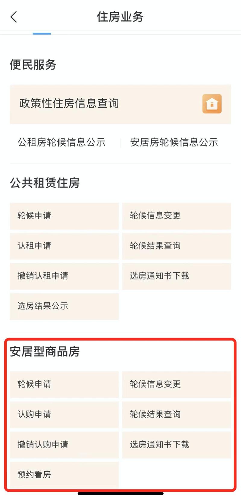 专区内提供公共租赁住房/安居型商品房轮候申请、轮候信息公示、轮候结果查询、认租/认购、下载选房通知书等实用服务。