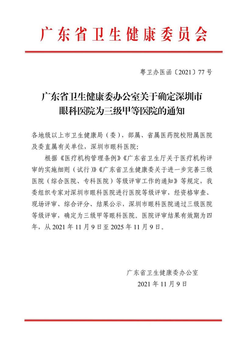2021年11月9日,广东省卫生健康委员会正式发文公布,深圳市眼科医院通过三级医院等级评审,确定为三级甲等眼科医院。