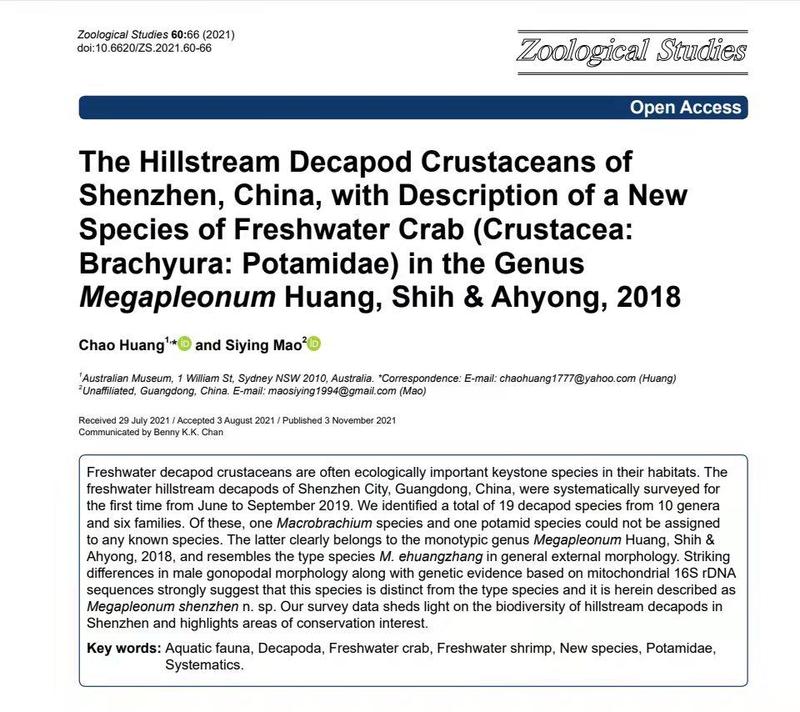 在11月发表的动物学研究国际期刊《动物学研究》上,发表了黄超博士和毛思颖研究员关于深圳山溪甲壳纲十足类(虾蟹类)的研究文章。文章在系统介绍深圳山溪十足类动物多样性的同时,描述了一个以深圳命名的新种——深圳巨腹蟹 ,填补了深圳山溪大型水生无脊椎动物多样性的研究空白。
