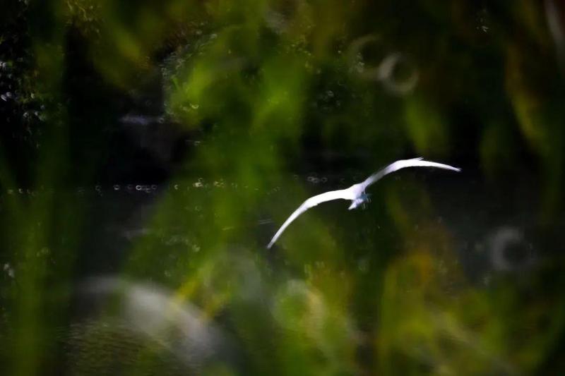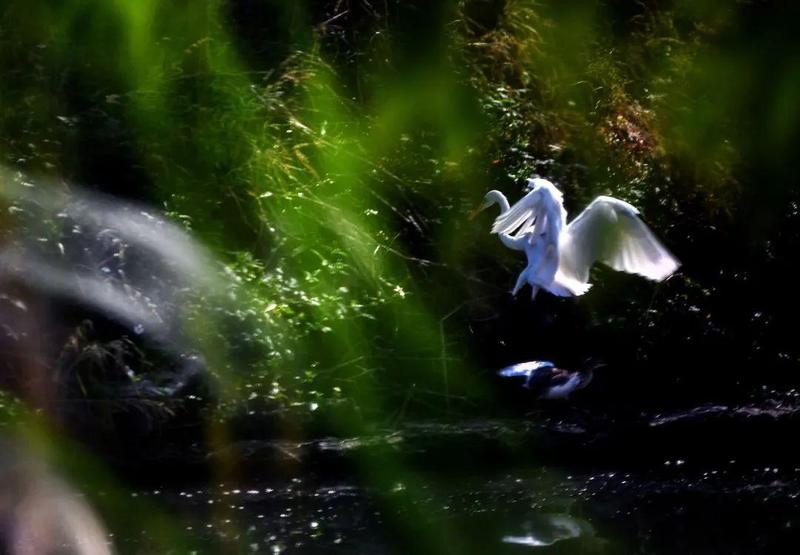 越往上游走,大沙河的原生态美景愈发醉人,鸟儿“扎堆”的场景随处可见。一个个小沙洲宛如碧玉,点缀在蜿蜒的河道上。白鹭、池鹭三五成群,时而追逐嬉戏,时而翩跹起舞。