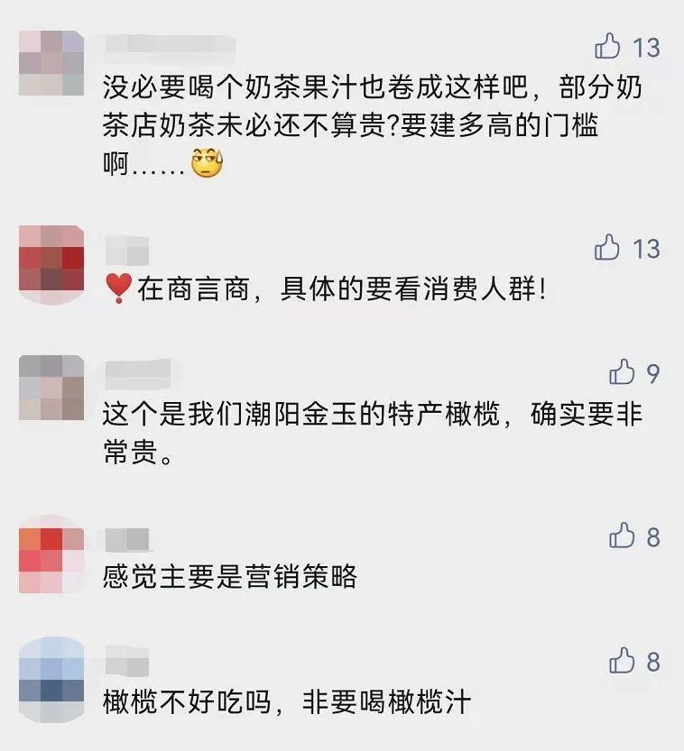 有人认为这款高价橄榄汁的定价是收智商税,无法想象也无法理解。不过,也有部分网友为这款金玉三捻橄榄汁站队。一网友表示,隔年的黄金香榄100块一斤很正常,而且橄榄本来就比较难出汁,做一杯橄榄汁人工成本比较高。也有网友提起广东新会陈年陈皮红豆沙一碗500元也有人买。