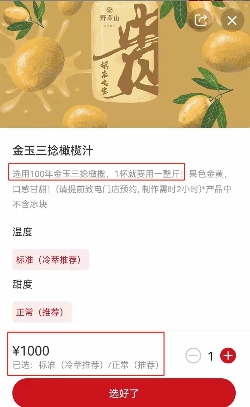 此前,一则“深圳奶茶店现1000元一杯饮料”的消息登上微博热搜。当事茶饮品牌“野萃山”门店工作人员回应称,该千元产品为橄榄汁,原料进价要800多元一斤,制作需要3个小时,因此价格较高。深圳市市场监管局针对此事在其官方微博回应称,已快速启动现场核查。