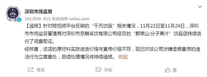 据深圳市市场监督管理局微博消息,深圳市市场监督管理局26日发布通报称,针对短视频平台反映的“千元饮品”相关情况,11月22日至11月24日,深圳市市场监督管理局对深圳市豪麟餐饮有限公司经营的“野萃山·分子果汁”饮品店持续进行了调查取证。