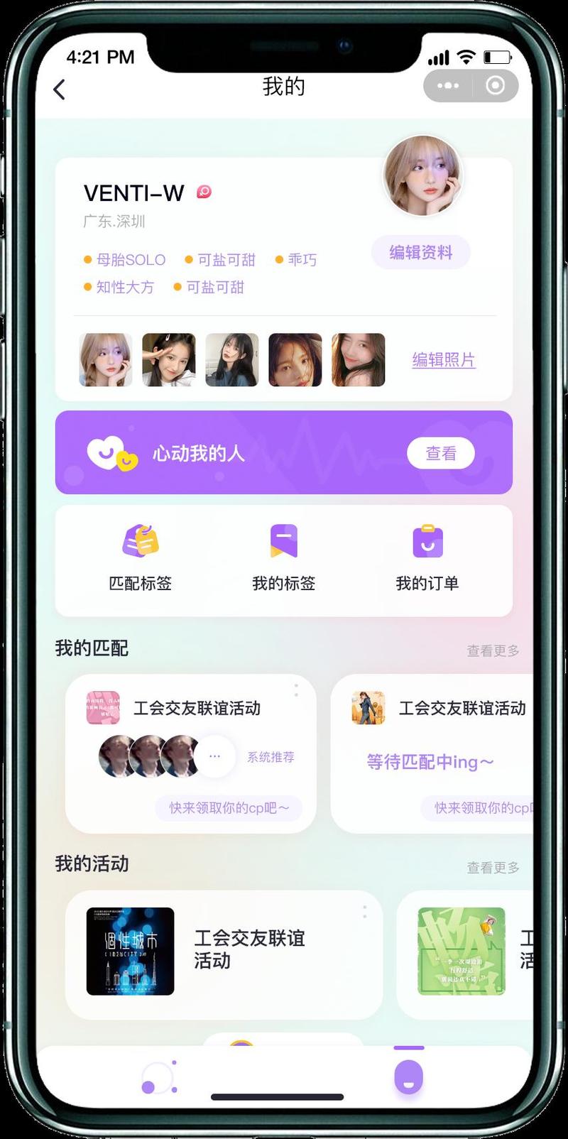 当异性满足你心仪的匹配标签(其中之一个)及年龄标签(其中之一个),系统将推送给你异性的资料信息,你可查看并为TA点击心动。如果TA也选择你,互选成功,成为cp(仅可互选成功一名)