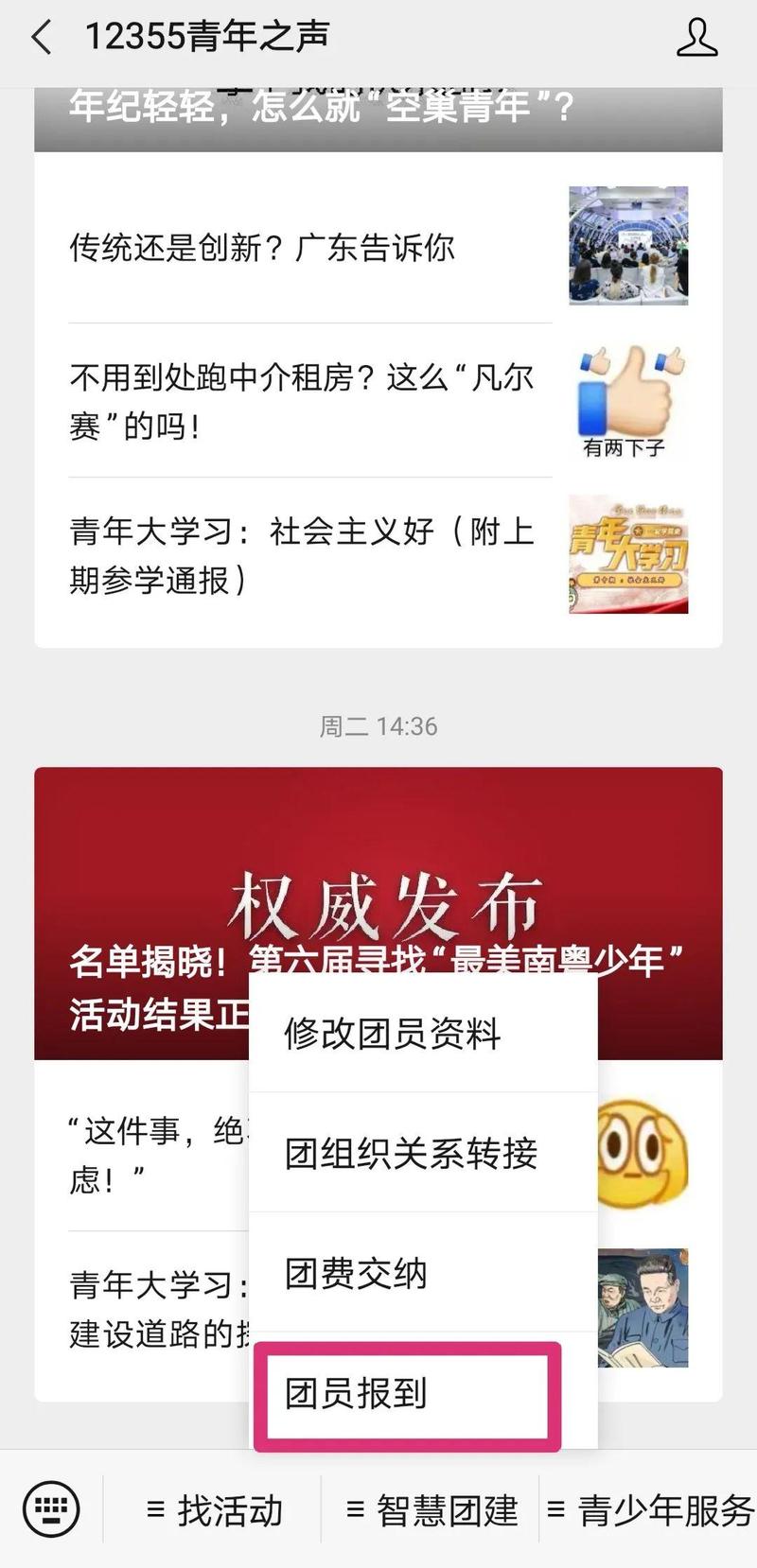 团员的线上报到需要在智慧团建上进行注册报到,省内、省外团员转接均需先登录微信搜索“12355青年之声”公众号。