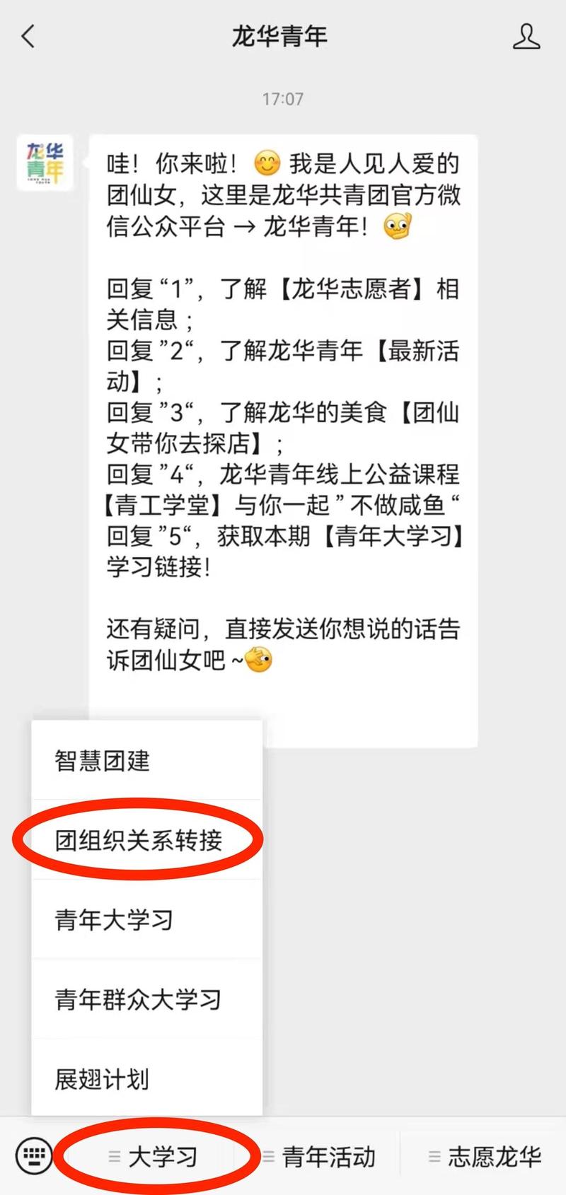点击关注“龙华青年”→点击菜单栏【大学习】→再点击【团组织关系转接】,就能找到啦。(如图所示)