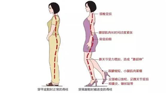 当穿上高跟鞋后,由于鞋跟高很容易使身体重心前移,上半身往前倾斜,而为了保持平衡,腰部就会不由自主地后仰,这就导致骨盆前倾,脊柱弯曲增大,很容易损伤椎骨。这种损伤日积月累,到了一定程度就会集中爆发,引发肩颈痛、腰背痛等症状。