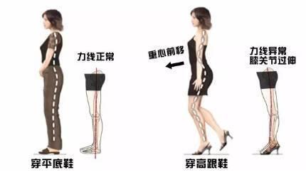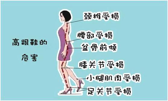 高跟鞋缺乏减震性能,影响脚踝在正常走路时的自然弯曲,被迫处于笔直且不能弯曲的位置,导致踝关节僵硬和酸痛;穿高跟鞋走路时增加了膝关节平常所承受的压力,这个压力叫做“膝关节转动力矩”,膝关节所受的转动力矩越大,膝关节周围的软骨组织就越容易损坏,增加关节面磨损,有研究发现,穿高跟鞋爬楼梯时,膝关节局部压力负荷是平时的3倍,下楼梯时更高达7~9倍。长期穿高跟鞋走路、爬楼梯,会加速膝关节退化,导致退行性膝关节炎提前到来。
