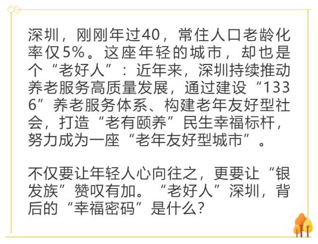 人民城市人民建,人民城市为人民。你永远可以相信“老好人”深圳,因为它不仅是年轻人追寻事业理想的“梦工厂”,更是“银发族”们安享幸福晚年的美好家园。