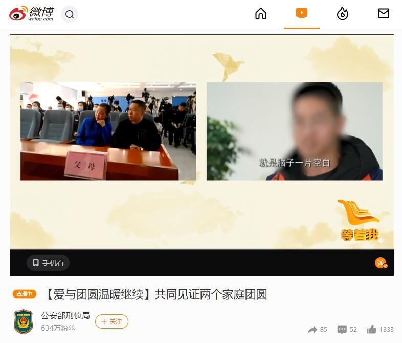 12月6日(周一)12:30,@公安部刑侦局 微博直播认亲仪式。