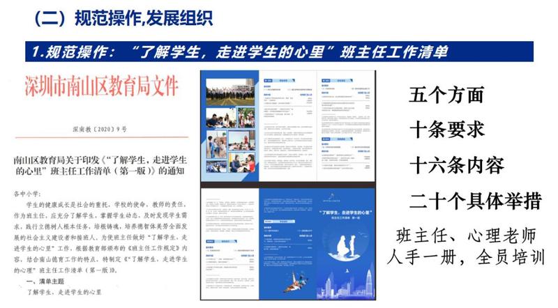 2018年,南山区出台《深圳市南山区中小幼德育行动计划》,提出德育的六大行动:方圆行动、培根行动、红星行动、灯塔行动、地图行动、摇篮行动。充分发挥“行政+专业”合力作用,聚焦班主任工作规范性、有效性提升。