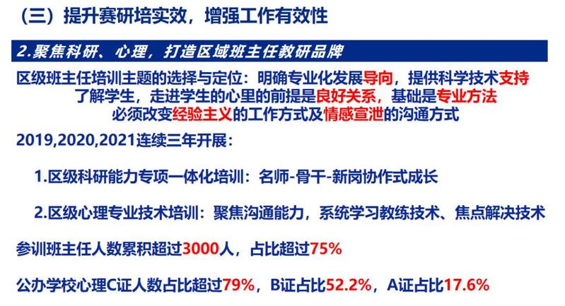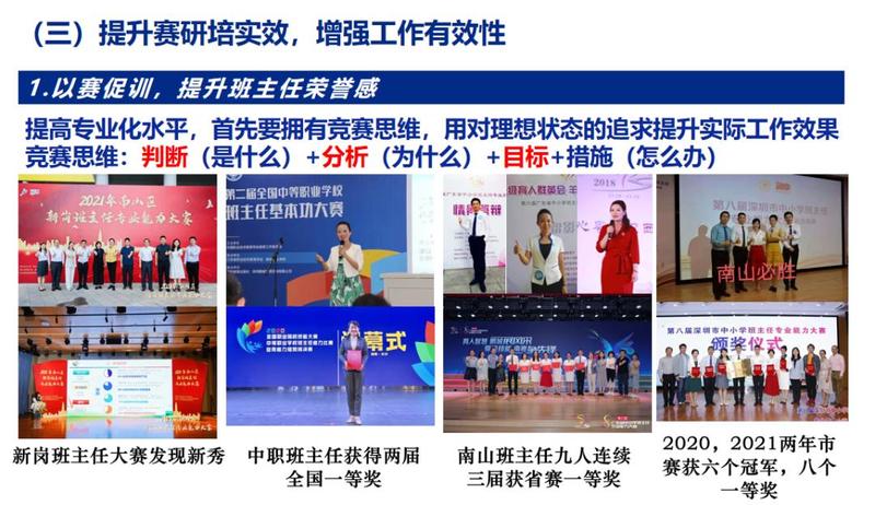 陈登福介绍,南山区鼓励班主任的方式是提升赛研培实效,增强工作有效性。具体做法有:1、以赛促训,提升班主任荣誉感;2、聚焦科研、心理,打造区域班主任教研品牌。