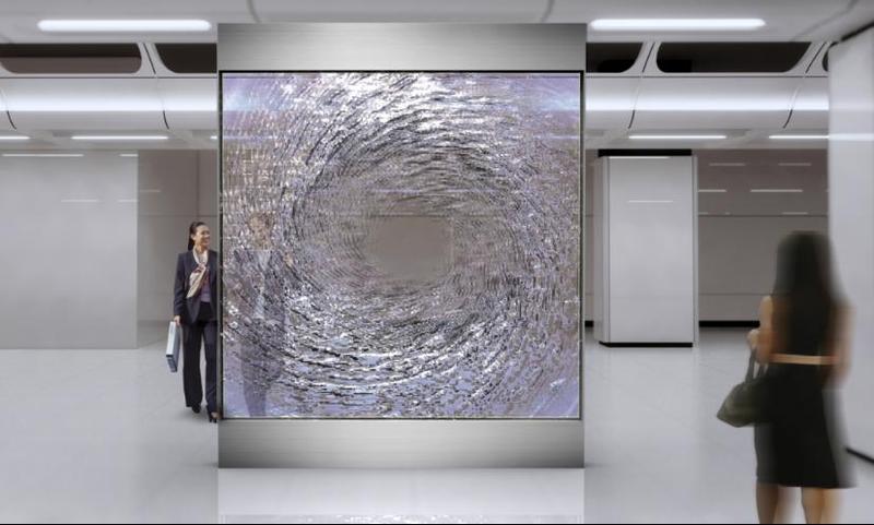 方案利用透光性材料进行内雕图案,将图案分层雕刻;造型既如水流般汇聚在一起,寓意人与信息、金融等的汇聚、交流。