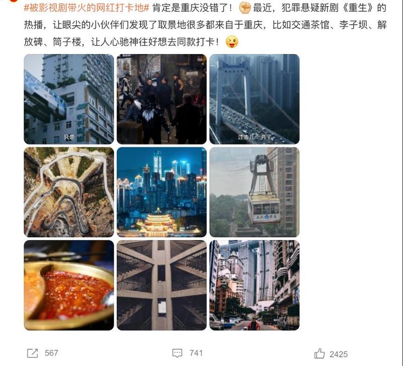 其中,山城重庆成为旅游发达城市榜单中的黑马,一方面在于本身拥有的特色旅游资源(李子坝、解放碑等),另一方面也得“感谢”《疯狂的石头》《少年的你》《重生》等影视带来的附加效应。