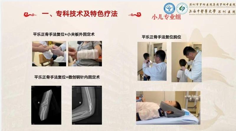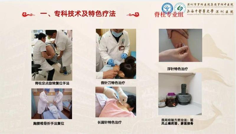 罗湖中医院历来遵行“发挥中医药优势,服务辖区群众”的服务宗旨,骨伤三科充分贯彻医院要求,不断创新中医特色,发挥中医药优势,提高中医特色技术水平,努力为每一位患者提供高质量服务。目前科室成熟开展的治疗项目有平乐正骨手法治疗脊柱骨折、手法复位小夹板固定治疗儿童四肢骨折、微针刀治疗颈椎病、腰椎间盘突出症,脊柱定点旋转复位手法治疗颈椎腰椎疾病,以及中药封包、中药熏药治疗等特色中医治疗项目,受到患者的普遍认可。