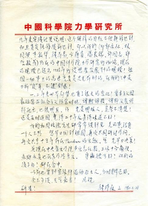 ▲此封书信是钱学森1960 年5 月28 日以中国科学院力学研究所所长的名义,写给当时正在美国的故交林家翘的。但不知何故,林家翘后来仅保留了最后一页书信,致使前一页的内容成为历史之谜。