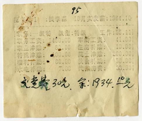 ▲图为钱学森1995 年10 月的工资单,上面的手迹为钱学森秘书涂元季记录的党费交纳金额。