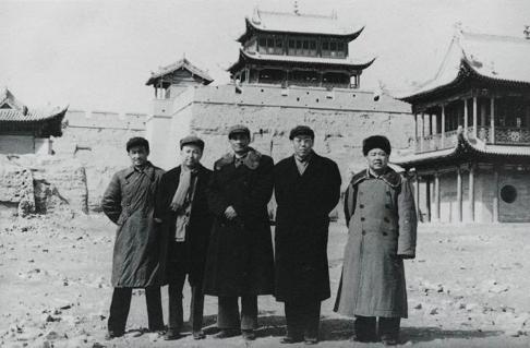 ▲钱学森在航天岁月里经常在保密状态下前往星散于全国各地的基地视察,图为他1962 年前往酒泉基地视察时于3 月28日途经嘉峪关时的留影(左起依次为陈信、钱学森、王诤、王秉璋、曹光琳)。