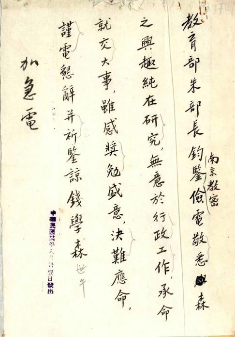 ▲1947 年8 月,时任中华民国教育部长的朱家骅拟聘钱学森为交通大学校长,以平息交通大学更换校长的风波;钱学森于8 月31 日致电朱家骅,表示自己“兴趣纯在研究,无意于行政工作”。图为钱学森当时的手稿。