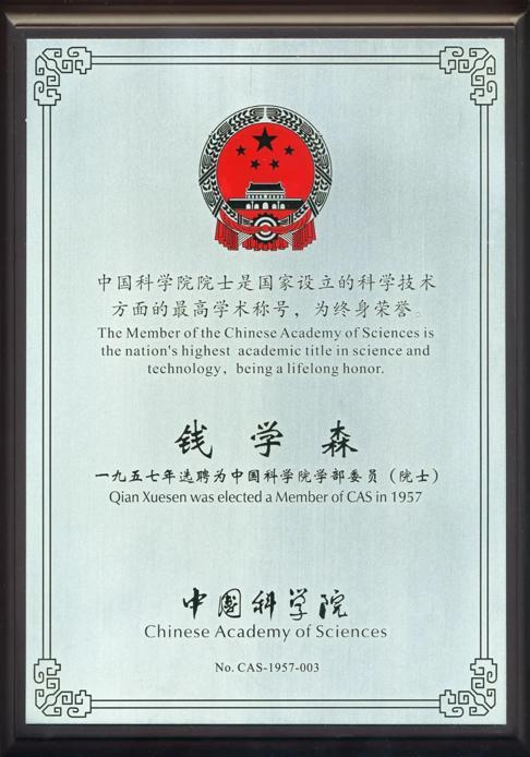 ▲图为中国科学院颁发给钱学森的“一九五七年选聘为中国科学院学部委员(院士)”奖牌。此奖牌是1994 年中国科学院建立院士制度之后补发的,上面铭刻着“中国科学院院士是国家设立的科学技术方面的最高学术称号,为终身荣誉”。