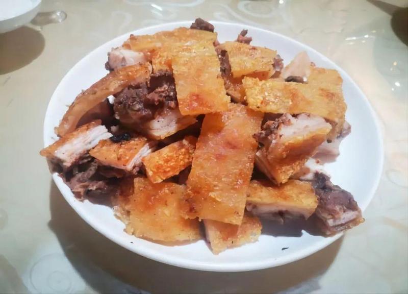 出炉刮去焦皮,外表皮金黄鲜亮,食之薄脆,肉质酥脆,骨香,肥而不腻,不仅色泽诱人,皮脆肉嫩。